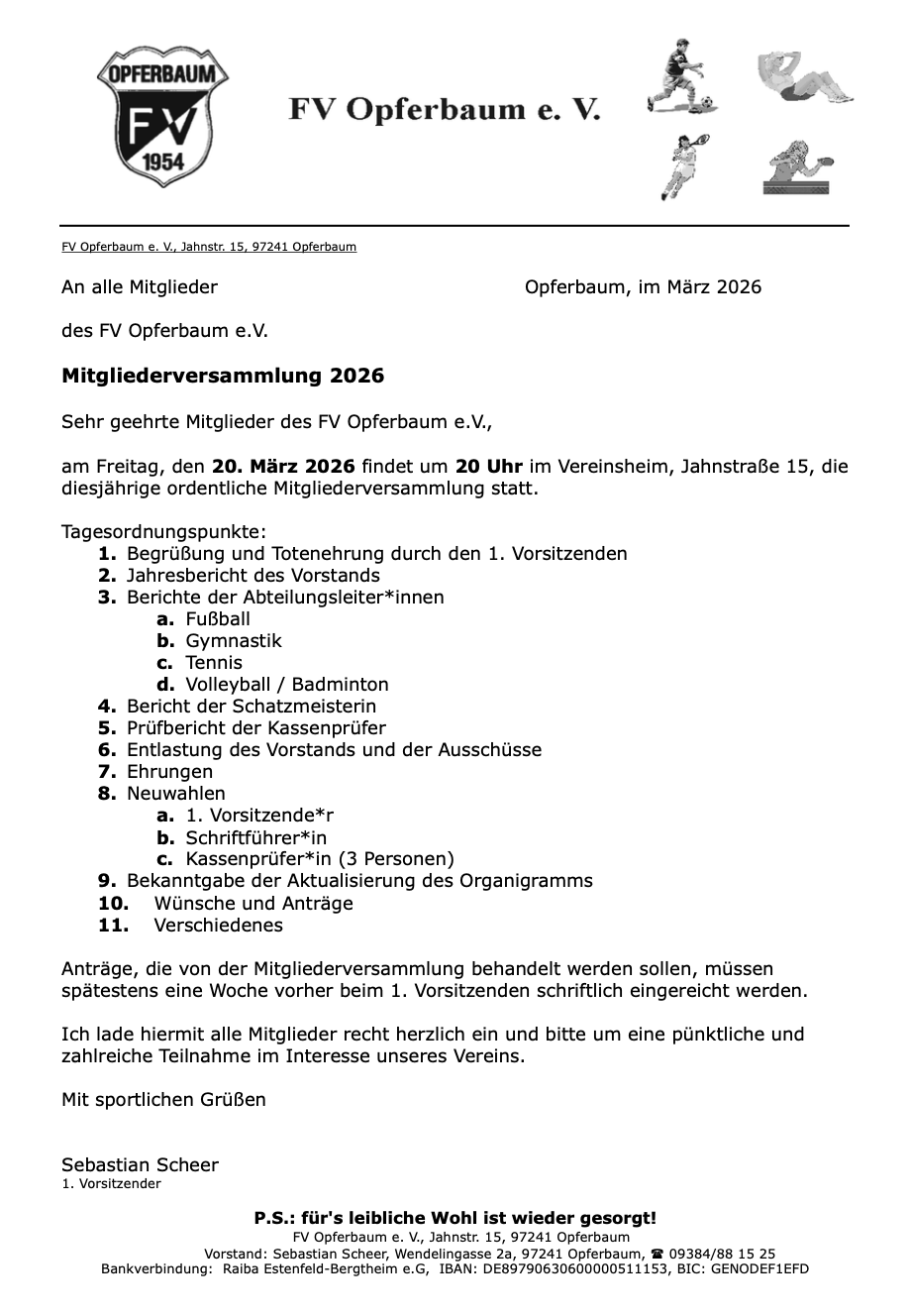 am Freitag, den 20. März 2026 findet um 20 Uhr im Vereinsheim, Jahnstraße 15, die diesjährige ordentliche Mitgliederversammlung statt.
