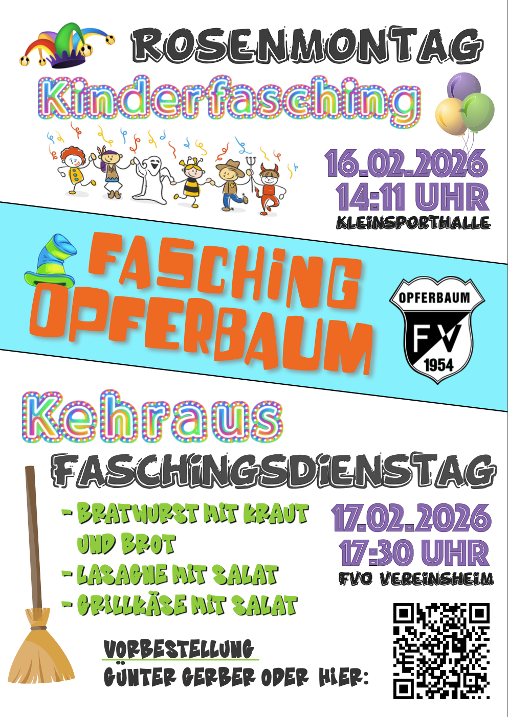 - Kehrausessen am Faschingsdienstag, 17.02.2026 ab 17:30 Uhr im FVO Vereinsheim